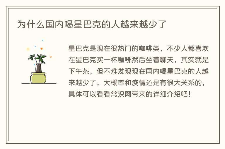 星巴克是现在很热门的咖啡类,不少人都喜欢在星巴克买一杯咖啡然后坐着聊天,其实就是下午茶,但不难发现现在国内喝星巴克的人越来越少了,大概率和疫情还是有很大关系的,具体可以看看常识网带来的详细介绍吧!