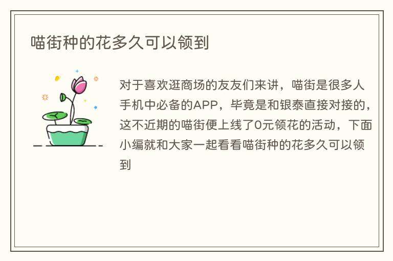 对于喜欢逛商场的友友们来讲,喵街是很多人手机中必备的APP,毕竟是和银泰直接对接的,这不近期的喵街便上线了0元领花的活动,下面小编就和大家一起看看喵街种的花多久可以领到