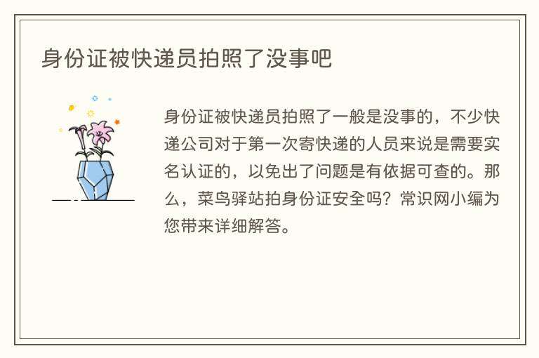 身份证被快递员拍照了一般是没事的,不少快递公司对于第一次寄快递的人员来说是需要实名认证的,以免出了问题是有依据可查的。那么,菜鸟驿站拍身份证安全吗?常识网小编为您带来详细解答。
