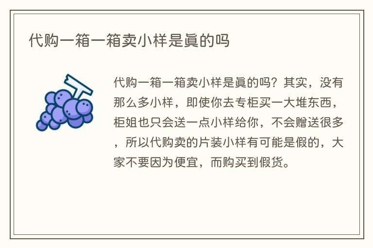 代购一箱一箱卖小样是真的吗?其实,没有那么多小样,即使你去专柜买一大堆东西,柜姐也只会送一点小样给你,不会赠送很多,所以代购卖的片装小样有可能是假的,大家不要因为便宜,而购买到假货。