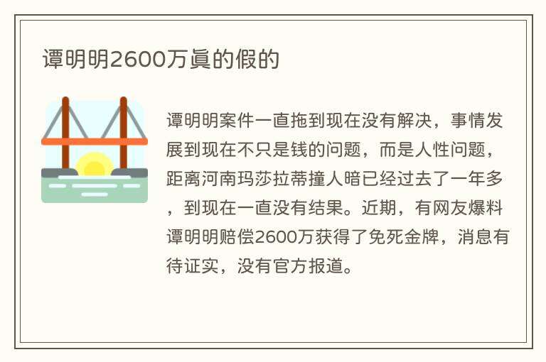 谭明明案件一直拖到现在没有解决,事情发展到现在不只是钱的问题,而是人性问题,距离河南玛莎拉蒂撞人暗已经过去了一年多,到现在一直没有结果。近期,有网友爆料谭明明赔偿2600万获得了免死金牌,消息有待证实,没有官方报道。