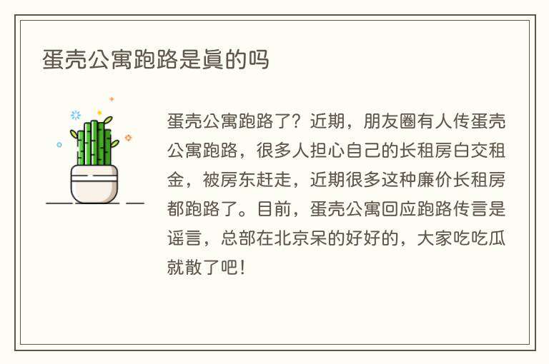 蛋壳公寓跑路了?近期,朋友圈有人传蛋壳公寓跑路,很多人担心自己的长租房白交租金,被房东赶走,近期很多这种廉价长租房都跑路了。目前,蛋壳公寓回应跑路传言是谣言,总部在北京呆的好好的,大家吃吃瓜就散了吧!