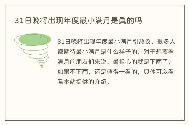 31日晚将出现年度最小满月引热议,很多人都期待最小满月是什么样子的,对于想要看满月的朋友们来说,最担心的就是下雨了,如果不下雨,还是值得一看的,具体可以看看本站提供的介绍。