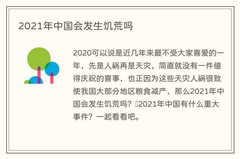 2020可以说是近几年来最不受大家喜爱的一年,先是人祸再是天灾,简直就没有一件值得庆祝的喜事,也正因为这些天灾人祸很致使我国大部分地区粮食减产,那么2021年中国会发生饥荒吗?2021年中国有什么重大事件?一起看看吧。
