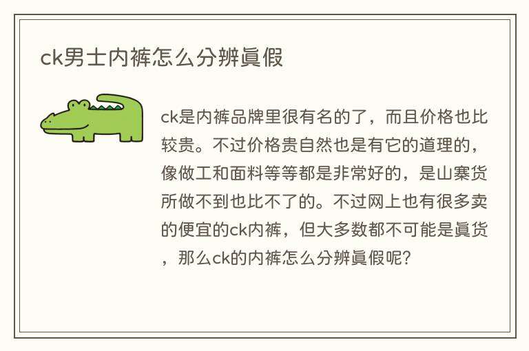 ck是内裤品牌里很有名的了,而且价格也比较贵。不过价格贵自然也是有它的道理的,像做工和面料等等都是非常好的,是山寨货所做不到也比不了的。不过网上也有很多卖的便宜的ck内裤,但大多数都不可能是真货,那么ck的内裤怎么分辨真假呢?