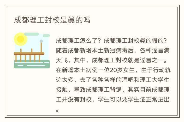 成都理工怎么了?成都理工封校真的假的?随着成都新增本土新冠病毒后,各种谣言满天飞,其中,成都理工封校就是谣言之一。在新增本土病例一位20岁女生,由于行动轨迹太多,去了各种各样的酒吧和理工大学生接触,导致成都理工背锅,其实目前成都理工并没有封校,学生可以凭学生证正常进出。
