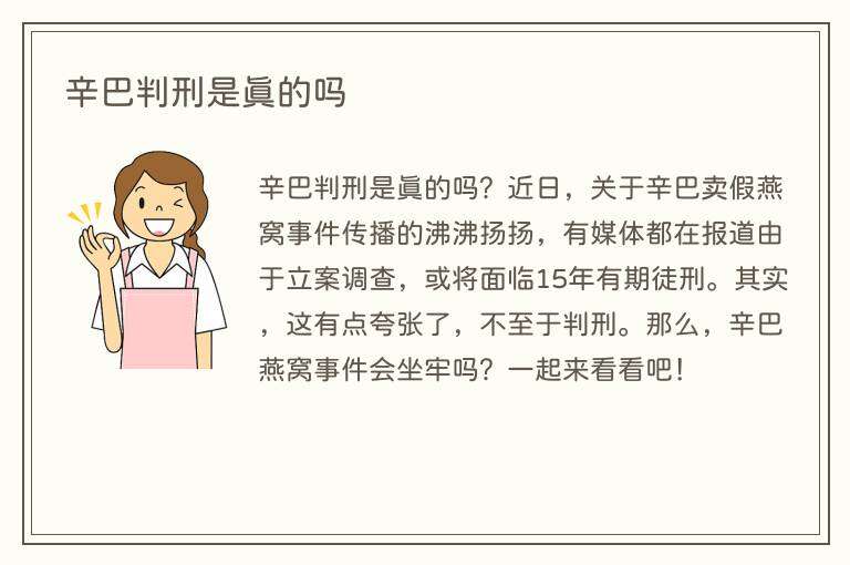 辛巴判刑是真的吗?近日,关于辛巴卖假燕窝事件传播的沸沸扬扬,有媒体都在报道由于立案调查,或将面临15年有期徒刑。其实,这有点夸张了,不至于判刑。那么,辛巴燕窝事件会坐牢吗?一起来看看吧!