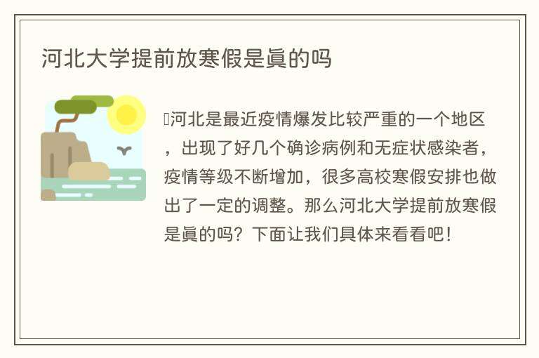 河北是最近疫情爆发比较严重的一个地区,出现了好几个确诊病例和无症状感染者,疫情等级不断增加,很多高校寒假安排也做出了一定的调整。那么河北大学提前放寒假是真的吗?下面让我们具体来看看吧!