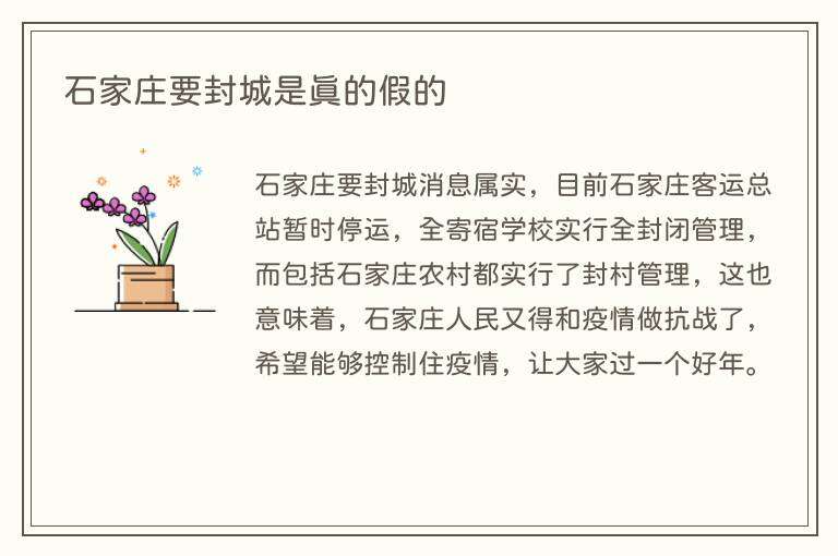 石家庄要封城消息属实,目前石家庄客运总站暂时停运,全寄宿学校实行全封闭管理,而包括石家庄农村都实行了封村管理,这也意味着,石家庄人民又得和疫情做抗战了,希望能够控制住疫情,让大家过一个好年。