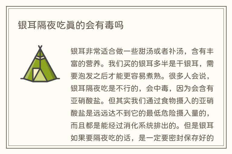 过夜喝银耳汤没问题,不会有毒。 但是,如果银耳保存不当,一些亚硝酸盐可能会滋生,但是如果将银耳密封24小时或48小时,其产生的亚硝酸含量就很小。 您可以将银耳密封在冰箱中,隔夜吃不会引起中毒。