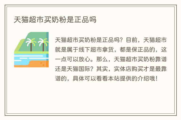 天猫超市买奶粉是正品吗?目前,天猫超市就是属于线下超市拿货,都是保正品的,这一点可以放心。那么,天猫超市买奶粉靠谱还是天猫国际?其实,实体店购买才是最靠谱的,具体可以看看本站提供的介绍哦!