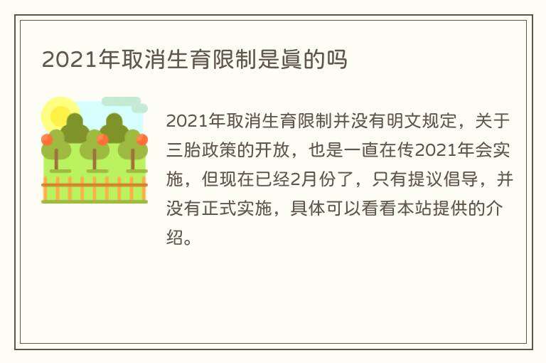 假的,目前暂时没有2021年取消生育限制的公开文件说明。