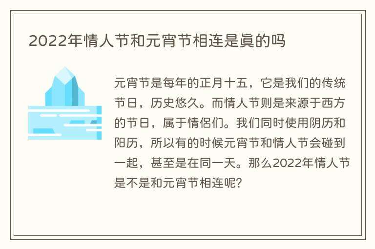 是真的。2022年的情人节是在2月14日星期一,农历正月十四;2022年的元宵节则是在2月15日星期二,农历正月初五。所以两个节日的确是连在一起的。不过这两个节日都不是法定节假日,所以是要正常上班的,不过下班之后还是有机会可以聚一聚的。