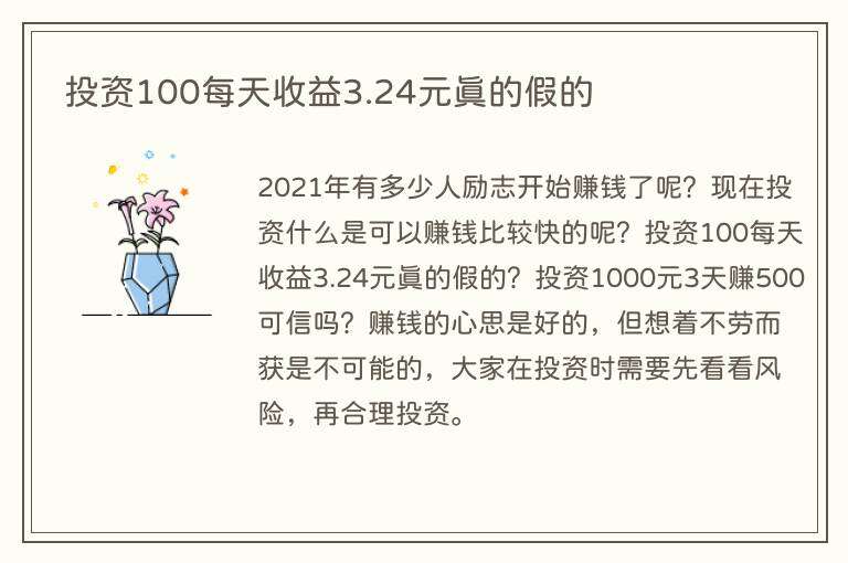 2021年有多少人励志开始赚钱了呢?现在投资什么是可以赚钱比较快的呢?投资100每天收益3.24元真的假的?投资1000元3天赚500可信吗?赚钱的心思是好的,但想着不劳而获是不可能的,大家在投资时需要先看看风险,再合理投资。