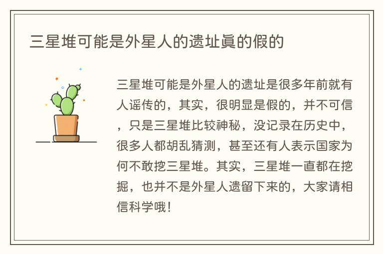 三星堆可能是外星人的遗址是很多年前就有人谣传的,其实,很明显是假的,并不可信,只是三星堆比较神秘,没记录在历史中,很多人都胡乱猜测,甚至还有人表示国家为何不敢挖三星堆。其实,三星堆一直都在挖掘,也并不是外星人遗留下来的,大家请相信科学哦!