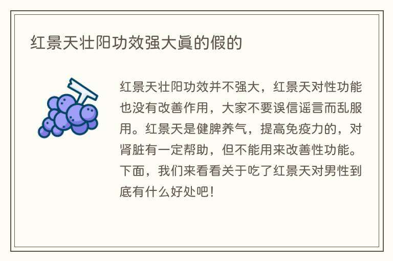 红景天壮阳功效并不强大,红景天对性功能也没有改善作用,大家不要误信谣言而乱服用。红景天是健脾养气,提高免疫力的,对肾脏有一定帮助,但不能用来改善性功能。下面,我们来看看关于吃了红景天对男性到底有什么好处吧!