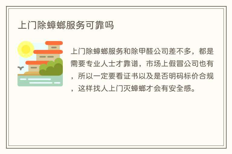 上门除蟑螂服务和除甲醛公司差不多,都是需要专业人士才靠谱,市场上假冒公司也有,所以一定要看证书以及是否明码标价合规,这样找人上门灭蟑螂才会有安全感。