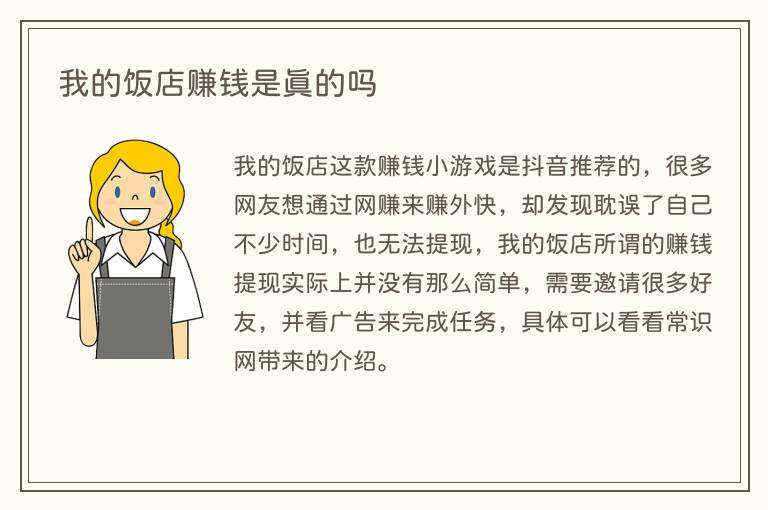 我的饭店这款赚钱小游戏是抖音推荐的,很多网友想通过网赚来赚外快,却发现耽误了自己不少时间,也无法提现,我的饭店所谓的赚钱提现实际上并没有那么简单,需要邀请很多好友,并看广告来完成任务,具体可以看看常识网带来的介绍。