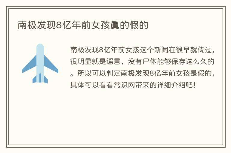 南极发现8亿年前女孩这个新闻在很早就传过,很明显就是谣言,没有尸体能够保存这么久的。所以可以判定南极发现8亿年前女孩是假的,具体可以看看常识网带来的详细介绍吧!