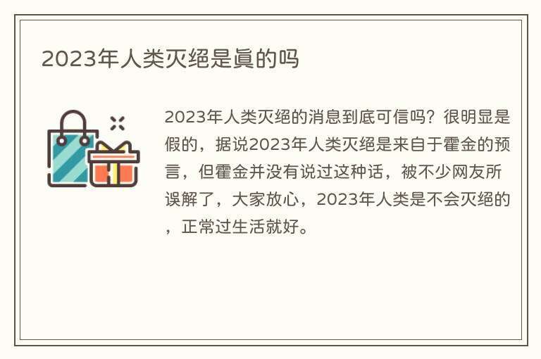 2023年人类灭绝的消息到底可信吗?很明显是假的,据说2023年人类灭绝是来自于霍金的预言,但霍金并没有说过这种话,被不少网友所误解了,大家放心,2023年人类是不会灭绝的,正常过生活就好。