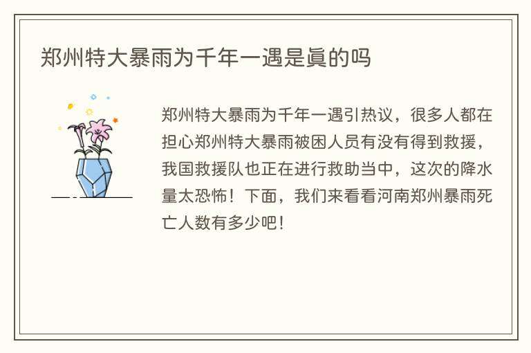 郑州特大暴雨为千年一遇引热议,很多人都在担心郑州特大暴雨被困人员有没有得到救援,我国救援队也正在进行救助当中,这次的降水量太恐怖!下面,我们来看看河南郑州暴雨死亡人数有多少吧!