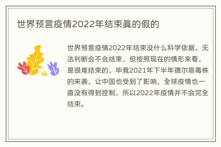 世界预言疫情2022年结束没什么科学依据,无法判断会不会结束,但按照现在的情形来看,是很难结束的,毕竟2021年下半年德尔塔毒株的来袭,让中国也受到了影响,全球疫情也一直没有得到控制,所以2022年疫情并不会完全结束。