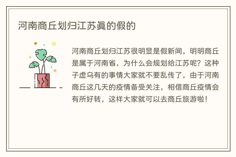 不是真的,查阅网络相关资料并没有发现将河南商丘划归江苏的任何说明,商丘市是全国性综合交通枢纽,已经投入众多资源建设铁路公路,高铁站,机场等中心城市硬核建设,所以应该不会划归到江苏,东面跟安徽淮北、江苏徐州接壤,西面跟河南开封接壤,南面跟河南周口挨着,北面与山东菏泽挨着,并没有跟江苏哪个城市紧挨着,所以应该不会划归到江苏,对于河南商丘划归江苏一说,有网友开玩笑说,这是有多想要江浙沪包邮服务。
