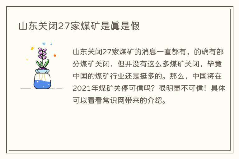 山东关闭27家煤矿的消息一直都有,的确有部分煤矿关闭,但并没有这么多煤矿关闭,毕竟中国的煤矿行业还是挺多的。那么,中国将在2021年煤矿关停可信吗?很明显不可信!具体可以看看常识网带来的介绍。