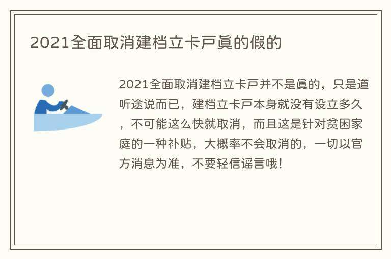 2021全面取消建档立卡户并不是真的,只是道听途说而已,建档立卡户本身就没有设立多久,不可能这么快就取消,而且这是针对贫困家庭的一种补贴,大概率不会取消的,一切以官方消息为准,不要轻信谣言哦!