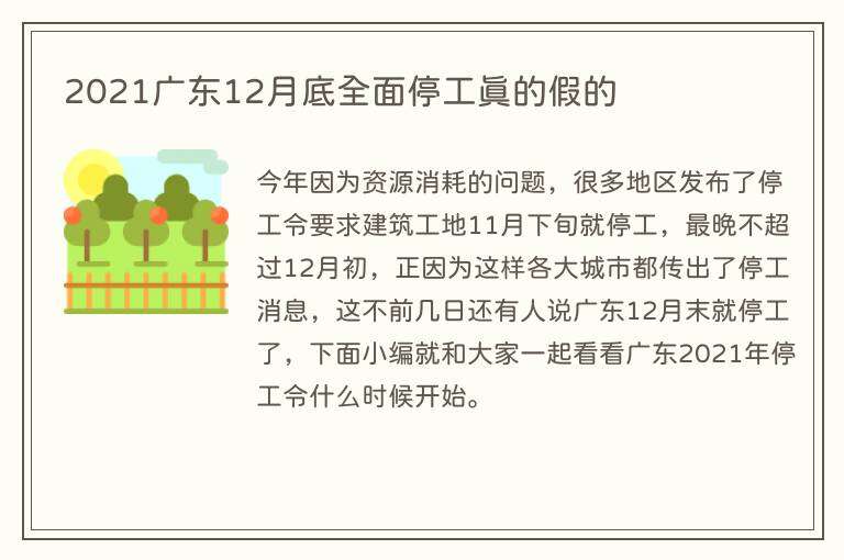 今年因为资源消耗的问题,很多地区发布了停工令要求建筑工地11月下旬就停工,最晚不超过12月初,正因为这样各大城市都传出了停工消息,这不前几日还有人说广东12月末就停工了,下面小编就和大家一起看看广东2021年停工令什么时候开始。
