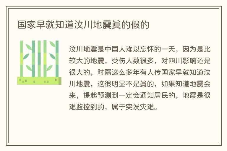 汶川地震是中国人难以忘怀的一天,因为是比较大的地震,受伤人数很多,对四川影响还是很大的,时隔这么多年有人传国家早就知道汶川地震,这很明显不是真的,如果知道地震会来,提起预测到一定会通知居民的,地震是很难监控到的,属于突发灾难。