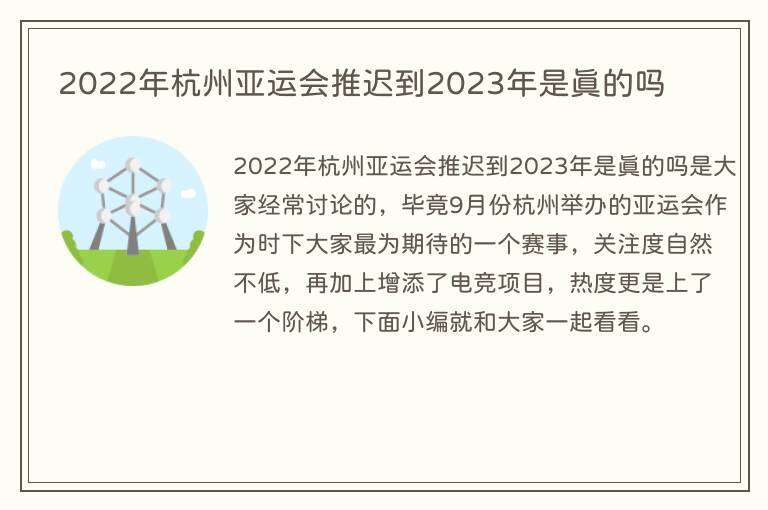 2022年杭州亚运会推迟到2023年是真的吗是大家经常讨论的,毕竟9月份杭州举办的亚运会作为时下大家最为期待的一个赛事,关注度自然不低,再加上增添了电竞项目,热度更是上了一个阶梯,下面小编就和大家一起看看。