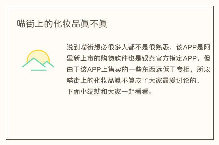 说到喵街想必很多人都不是很熟悉,该APP是阿里新上市的购物软件也是银泰官方指定APP,但由于该APP上售卖的一些东西远低于专柜,所以喵街上的化妆品真不真成了大家最爱讨论的,下面小编就和大家一起看看。