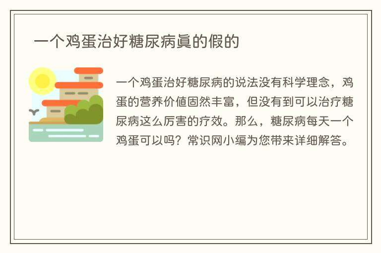 一个鸡蛋治好糖尿病的说法没有科学理念,鸡蛋的营养价值固然丰富,但没有到可以治疗糖尿病这么厉害的疗效。那么,糖尿病每天一个鸡蛋可以吗?常识网小编为您带来详细解答。