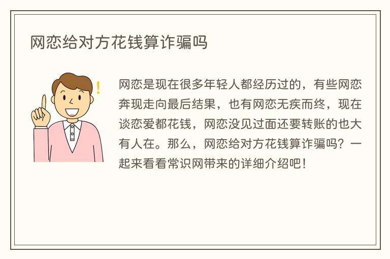 网恋是现在很多年轻人都经历过的,有些网恋奔现走向最后结果,也有网恋无疾而终,现在谈恋爱都花钱,网恋没见过面还要转账的也大有人在。那么,网恋给对方花钱算诈骗吗?一起来看看常识网带来的详细介绍吧!