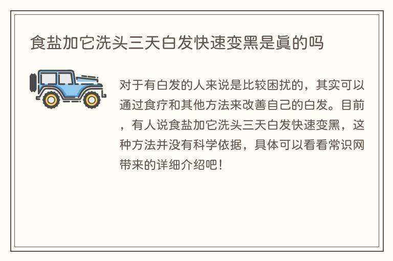 对于有白发的人来说是比较困扰的,其实可以通过食疗和其他方法来改善自己的白发。目前,有人说食盐加它洗头三天白发快速变黑,这种方法并没有科学依据,具体可以看看常识网带来的详细介绍吧!