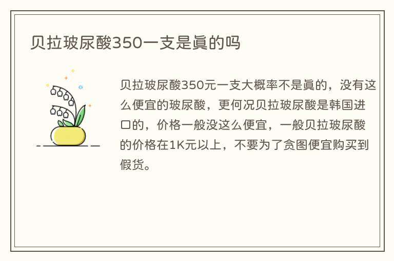 贝拉玻尿酸350元一支大概率不是真的,没有这么便宜的玻尿酸,更何况贝拉玻尿酸是韩国进口的,价格一般没这么便宜,一般贝拉玻尿酸的价格在1K元以上,不要为了贪图便宜购买到假货。