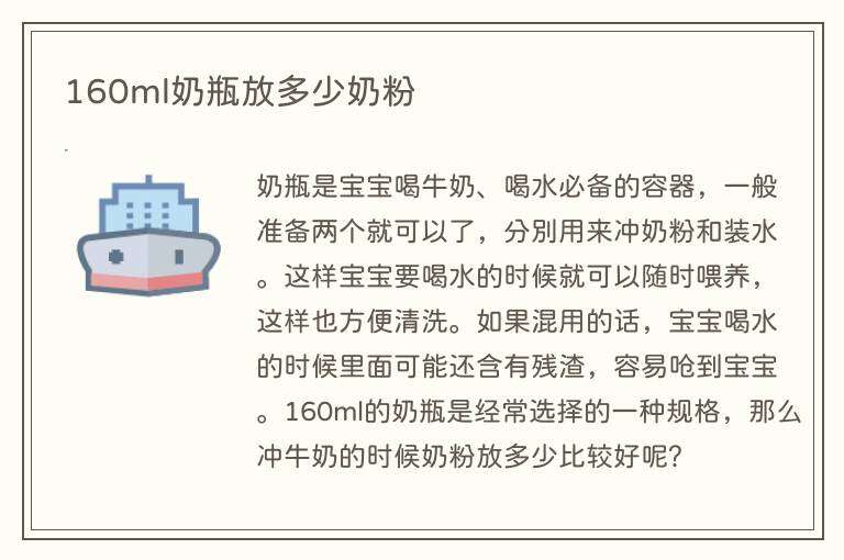 正常来说160ml的奶瓶放2-3勺的奶粉就足够了,因为奶瓶的容量并没有太大,如果放了太多勺奶粉的话反而会让奶粉冲不匀。160ml的奶瓶一般来说是可以用到宝宝六个月的,六个月之内的宝宝饮食量并不会太大,160ml的奶瓶已经足够宝宝食用的了。