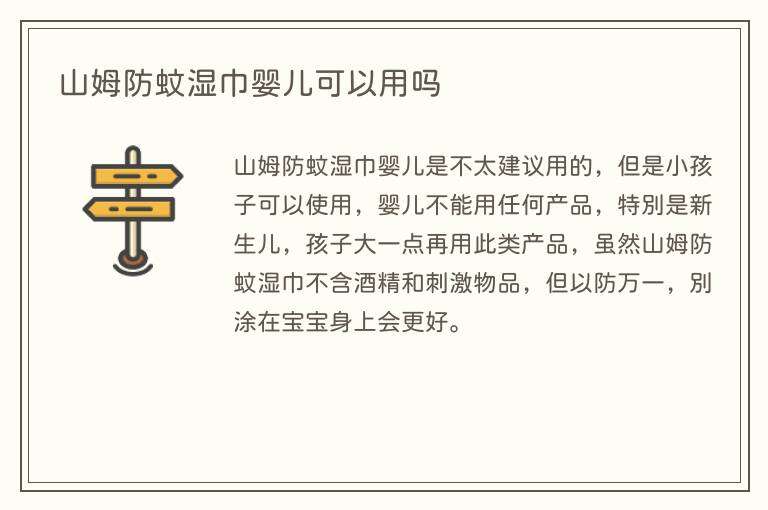 山姆防蚊湿巾婴儿是不太建议用的,但是小孩子可以使用,婴儿不能用任何产品,特别是新生儿,孩子大一点再用此类产品,虽然山姆防蚊湿巾不含酒精和刺激物品,但以防万一,别涂在宝宝身上会更好。