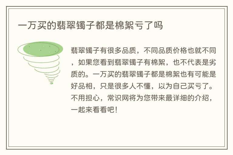 翡翠镯子有很多品质,不同品质价格也就不同,如果您看到翡翠镯子有棉絮,也不代表是劣质的。一万买的翡翠镯子都是棉絮也有可能是好品相,只是很多人不懂,以为自己买亏了。不用担心,常识网将为您带来最详细的介绍,一起来看看吧!