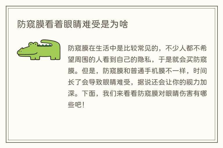 防窥膜在生活中是比较常见的,不少人都不希望周围的人看到自己的隐私,于是就会买防窥膜。但是,防窥膜和普通手机膜不一样,时间长了会导致眼睛难受,据说还会让你的视力加深。下面,我们来看看防窥膜对眼睛伤害有哪些吧!