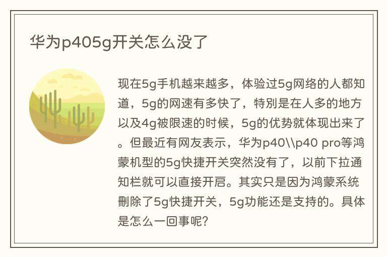 现在5g手机越来越多,体验过5g网络的人都知道,5g的网速有多快了,特别是在人多的地方以及4g被限速的时候,5g的优势就体现出来了。但最近有网友表示,华为p40\p40 pro等鸿蒙机型的5g快捷开关突然没有了,以前下拉通知栏就可以直接开启。其实只是因为鸿蒙系统删除了5g快捷开关,5g功能还是支持的。具体是怎么一回事呢?