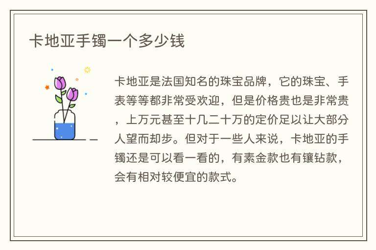 卡地亚的手镯并不便宜,毕竟是知名珠宝品牌,基本都在上万元左右,甚至高达二三十万。小号素金手镯会便宜一些,在三万元左右,镶钻款的就要更贵了,价格和镶钻的颗数有关,镶嵌一颗的大概在四万元左右,满钻的更贵,高达二十几万。