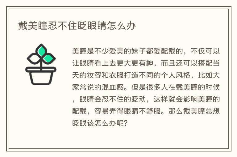 美瞳是不少爱美的妹子都爱配戴的,不仅可以让眼睛看上去更大更有神,而且还可以搭配当天的妆容和衣服打造不同的个人风格,比如大家常说的混血感。但是很多人在戴美瞳的时候,眼睛会忍不住的眨动,这样就会影响美瞳的配戴,容易弄得眼睛不舒服。那么戴美瞳总想眨眼该怎么办呢?