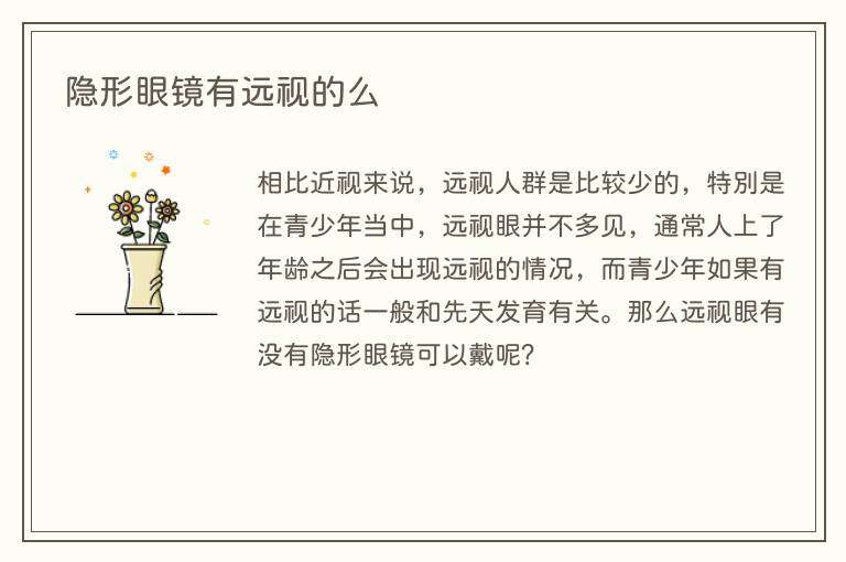 有远视的隐形眼镜,不过大多需要到专业的眼镜店或者眼科医院定制。因为近视眼镜是凹透镜,所以近视隐形眼镜是凹面透明膜; 远视眼镜是凸透镜,一般凸膜会压迫眼球,所以需要特殊制作。一定要根据自己的黑眼球大小定制自己的隐形眼镜,这样才能有更好的效果,而且如果要为远视患者定制隐形眼镜,价格会比普通隐形眼镜贵一点。