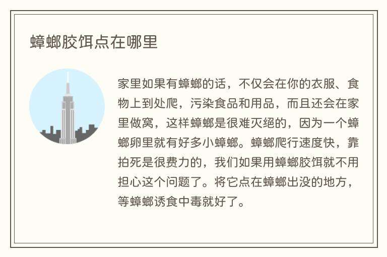 家里如果有蟑螂的话,不仅会在你的衣服、食物上到处爬,污染食品和用品,而且还会在家里做窝,这样蟑螂是很难灭绝的,因为一个蟑螂卵里就有好多小蟑螂。蟑螂爬行速度快,靠拍死是很费力的,我们如果用蟑螂胶饵就不用担心这个问题了。将它点在蟑螂出没的地方,等蟑螂诱食中毒就好了。