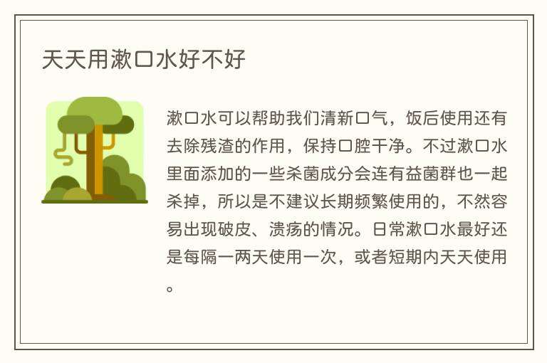漱口水可以帮助我们清新口气,饭后使用还有去除残渣的作用,保持口腔干净。不过漱口水里面添加的一些杀菌成分会连有益菌群也一起杀掉,所以是不建议长期频繁使用的,不然容易出现破皮、溃疡的情况。日常漱口水最好还是每隔一两天使用一次,或者短期内天天使用。