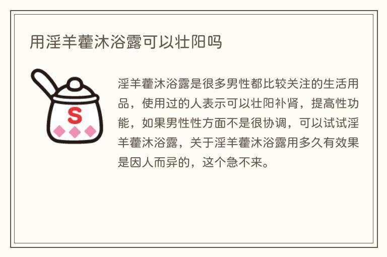 用淫羊藿沐浴露是可以壮阳的,它有一定的促进作用,其中致奇男士淫羊藿沐浴露相对于其他淫羊藿沐浴露产品来说,它有独特的优势,这款沐浴露不仅含有核心成分淫羊藿,还加入了人参提取物和牡蛎壳提取物,对男人壮阳补肾方面的帮助特别大,能去除疲劳,提升男性精力,激发荷尔蒙,并且致奇男士淫羊藿沐浴露成分安全,质量过关效果也有保障,洗完之后立竿见硬,能达到持久挺勃。
