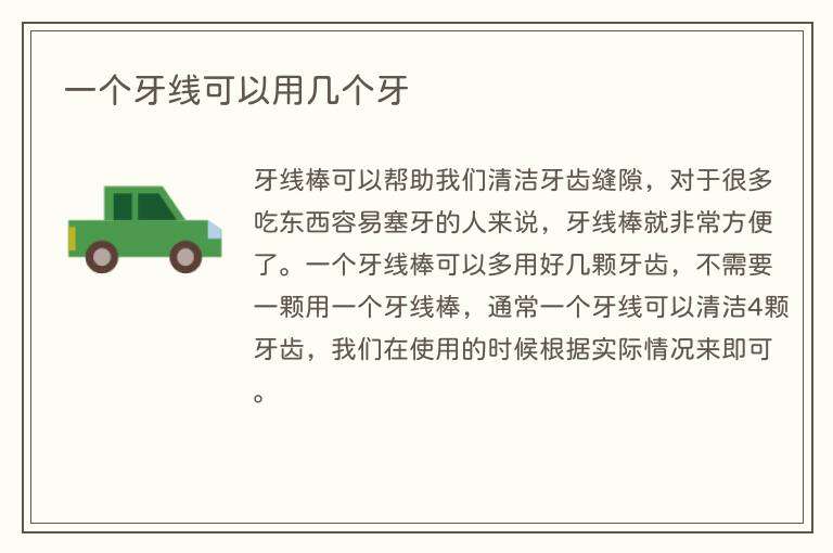 牙线棒可以帮助我们清洁牙齿缝隙,对于很多吃东西容易塞牙的人来说,牙线棒就非常方便了。一个牙线棒可以多用好几颗牙齿,不需要一颗用一个牙线棒,通常一个牙线可以清洁4颗牙齿,我们在使用的时候根据实际情况来即可。