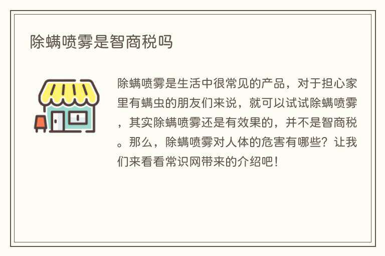 除螨喷雾是生活中很常见的产品,对于担心家里有螨虫的朋友们来说,就可以试试除螨喷雾,其实除螨喷雾还是有效果的,并不是智商税。那么,除螨喷雾对人体的危害有哪些?让我们来看看常识网带来的介绍吧!